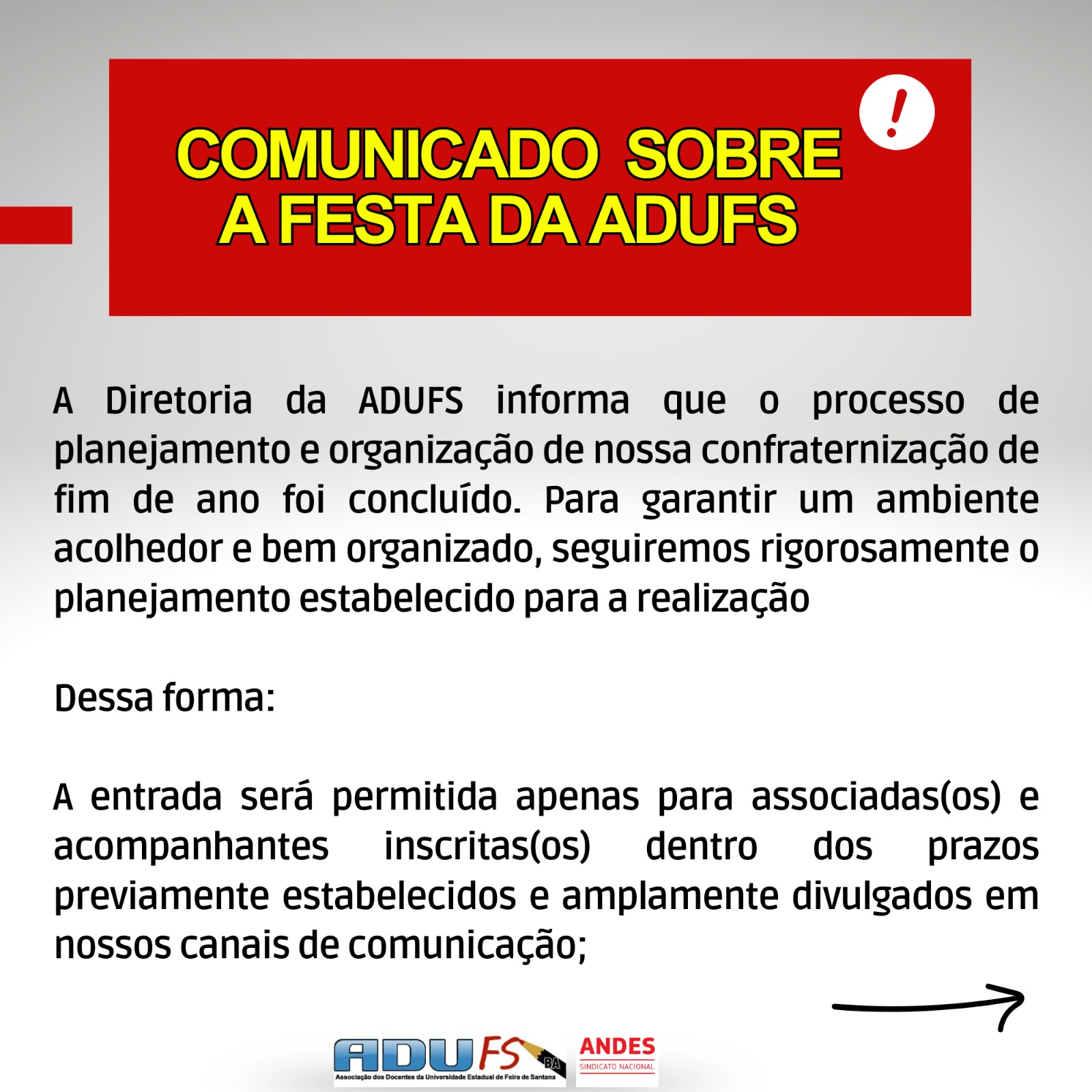 A Diretoria da ADUFS informa que o processo de planejamento e organização de nossa confraternização de fim de ano foi concluído. Para garantir um ambiente acolhedor e bem organizado, seguiremos ...