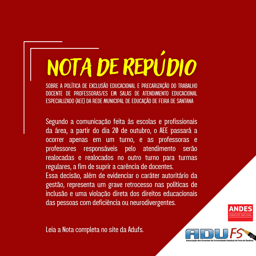 NOTA DE REPÚDIO SOBRE A POLÍTICA DE EXCLUSÃO EDUCACIONAL E PRECARIZAÇÃO DO TRABALHO DOCENTE DE PROFESSORAS/ES EM SALAS DE ATENDIMENTO EDUCACIONAL ESPECIALIZADO (AEE) DA REDE MUNICIPAL DE EDUCAÇÃO DE FEIRA DE SANTANA
