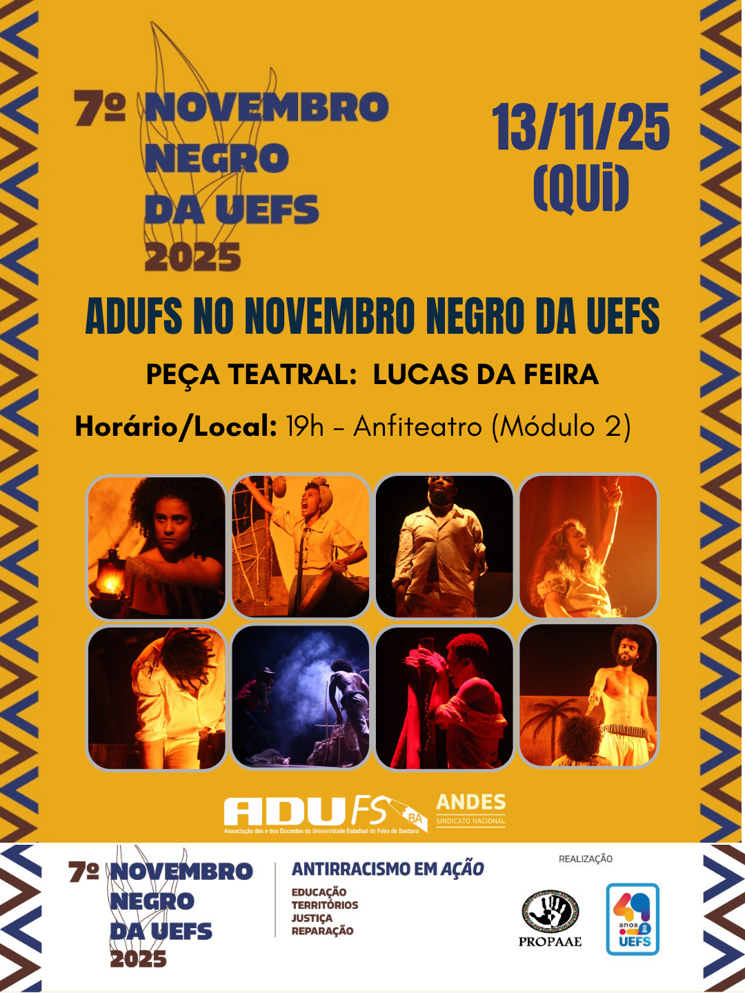 Já no dia 13 de novembro, será a vez da apresentação da peça Lucas da Feira, às 19 horas, no Anfiteatro do Módulo II. Pela primeira vez sendo exibida na UEFS, o espetáculo conta com o texto e a direção de Fernando Souza.