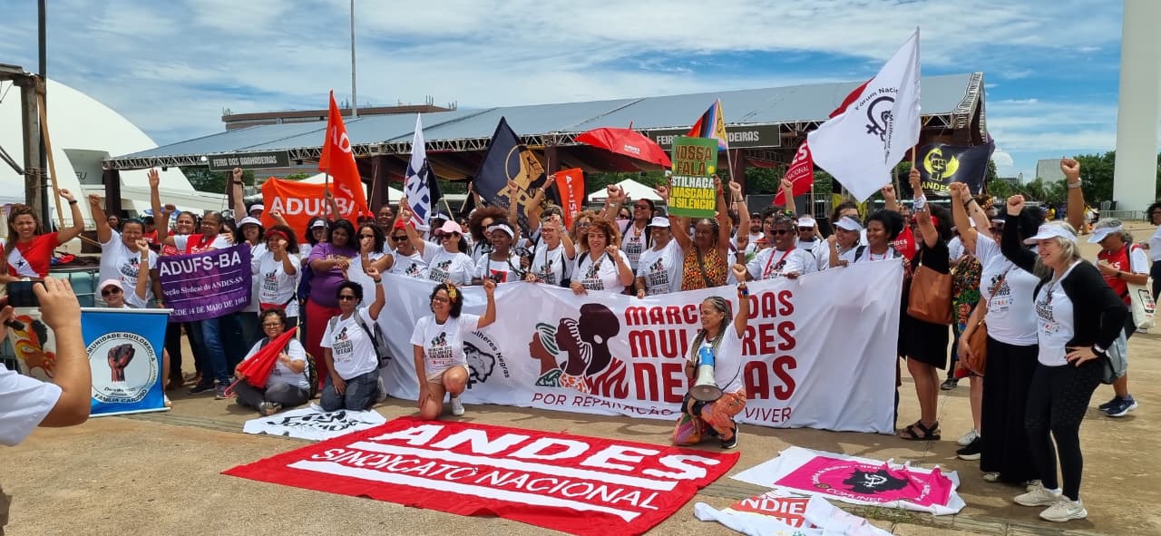 Uma comitiva da Seção Sindical participou da Marcha com representantes da diretoria, Coletivo de Docentes Negras e Negros e do Grupo de Trabalho para Políticas de Classe, Étnico-Racial, de Gênero e Diversidade Sexual (GTPCEGDS). Junto ao Andes-SN, que apoiou a logística, as docentes compuseram a Comissão de Saúde e Segurança, prestando assistência para a realização da mobilização em condições adequadas para as milhares de mulheres presentes.