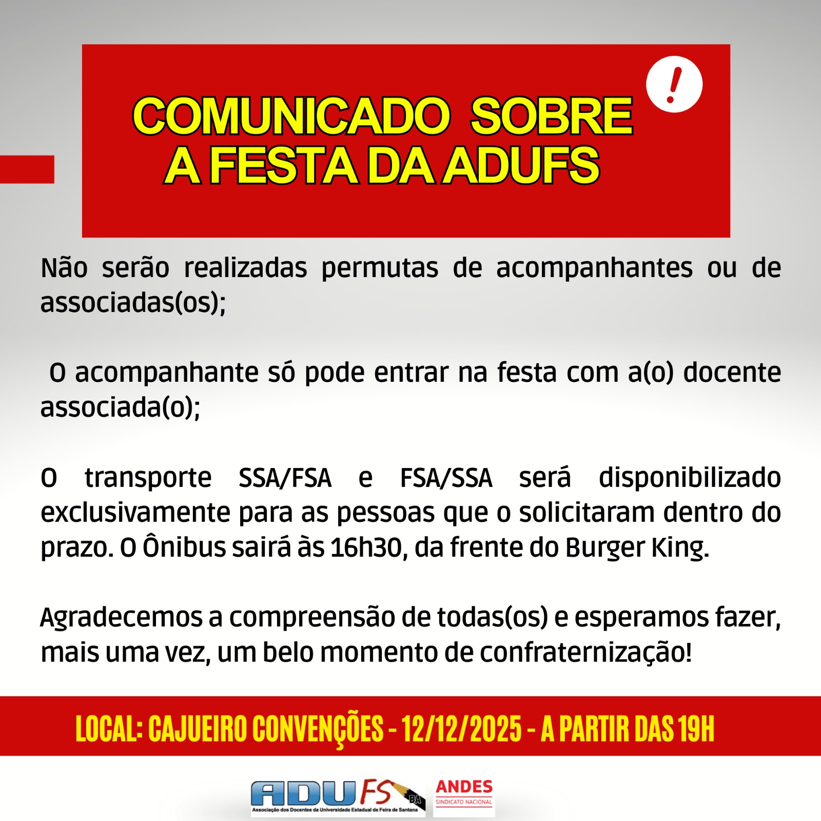 ✅ O transporte SSA/FSA e FSA/SSA será disponibilizado exclusivamente para as pessoas que o solicitaram dentro do prazo. O Ônibus sairá às 16h30, da frente do Burger King.