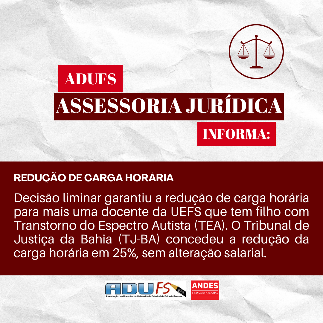 Por meio da Assessoria Jurídica, a Adufs conquistou decisão liminar que garante a redução de carga horária para mais uma docente da Universidade Estadual de Feira de Santana (UEFS), que tem filho com Transtorno do Espectro Autista (TEA). O Tribunal de Justiça da Bahia (TJ-BA) concedeu a redução da carga horária em 25%, sem alteração salarial, por entender que ela garante os princípios presentes o artigo 4º do Estatuto da Criança e do Adolescente que versa sobre a efetivação dos direitos referentes à vida, à saúde.