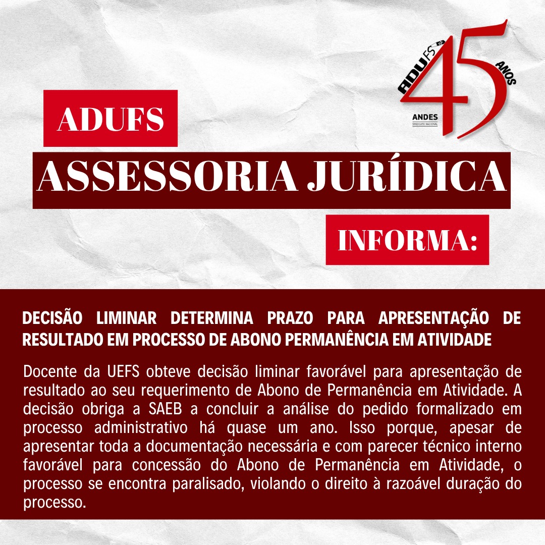 Docente da Universidade Estadual de Feira de Santana (UEFS) obteve decisão liminar favorável para apresentação de resultado ao seu requerimento de Abono de Permanência em Atividade. A decisão obriga a Secretaria de Administração do Estado da Bahia (SAEB) a concluir a análise do pedido formalizado em processo administrativo há quase um ano. Isso porque, apesar de apresentar toda a documentação necessária e com parecer técnico interno favorável para concessão do Abono de Permanência em Atividade, o processo se encontra paralisado, violando o direito à razoável duração do processo.