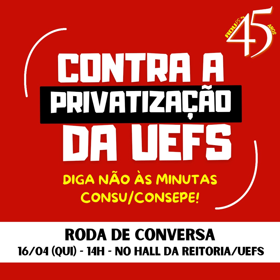 No próximo dia 16 de abril, às 14 horas, a Adufs realizará uma roda de conversa “Contra a Privatização da UEFS”, no hall da Reitoria, para discutir as Minutas de Resolução que serão apreciadas nas reuniões do Consu e Consepe. A ação faz parte da mobilização da Adufs para ampliar a discussão em torno de temas caros para a UEFS.