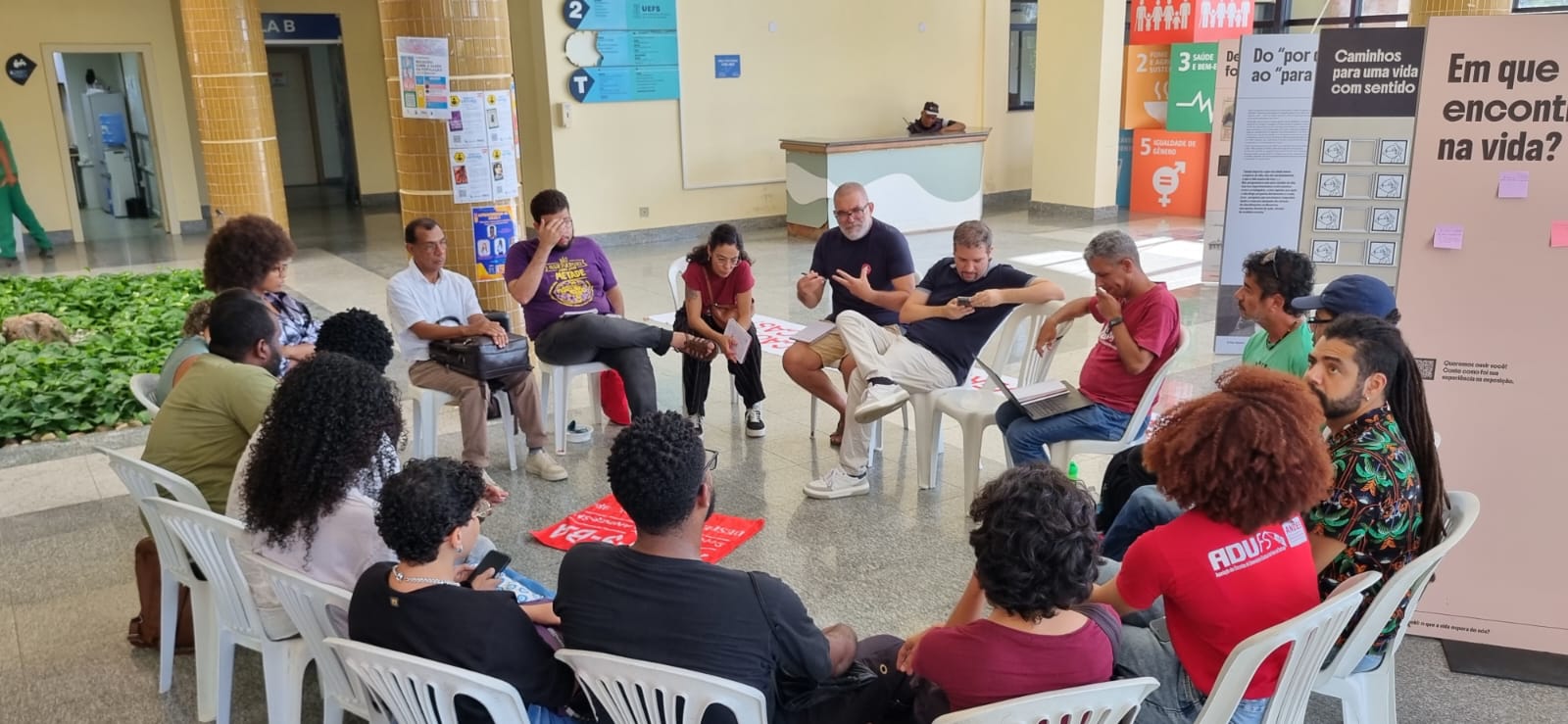 Nesta quinta-feira, 16 de abril, a Adufs realizou uma Roda de Conversa, no Hall da Reitoria da Universidade Estadual de Feira de Santana (UEFS), para discutir as Minutas de Resolução que serão apreciadas nas reuniões do Consu e Consepe. Além de representantes da Diretoria, estiveram presentes docentes da base, integrantes do Diretório Central dos Estudantes (DCE), demais estudantes e servidoras(es).
