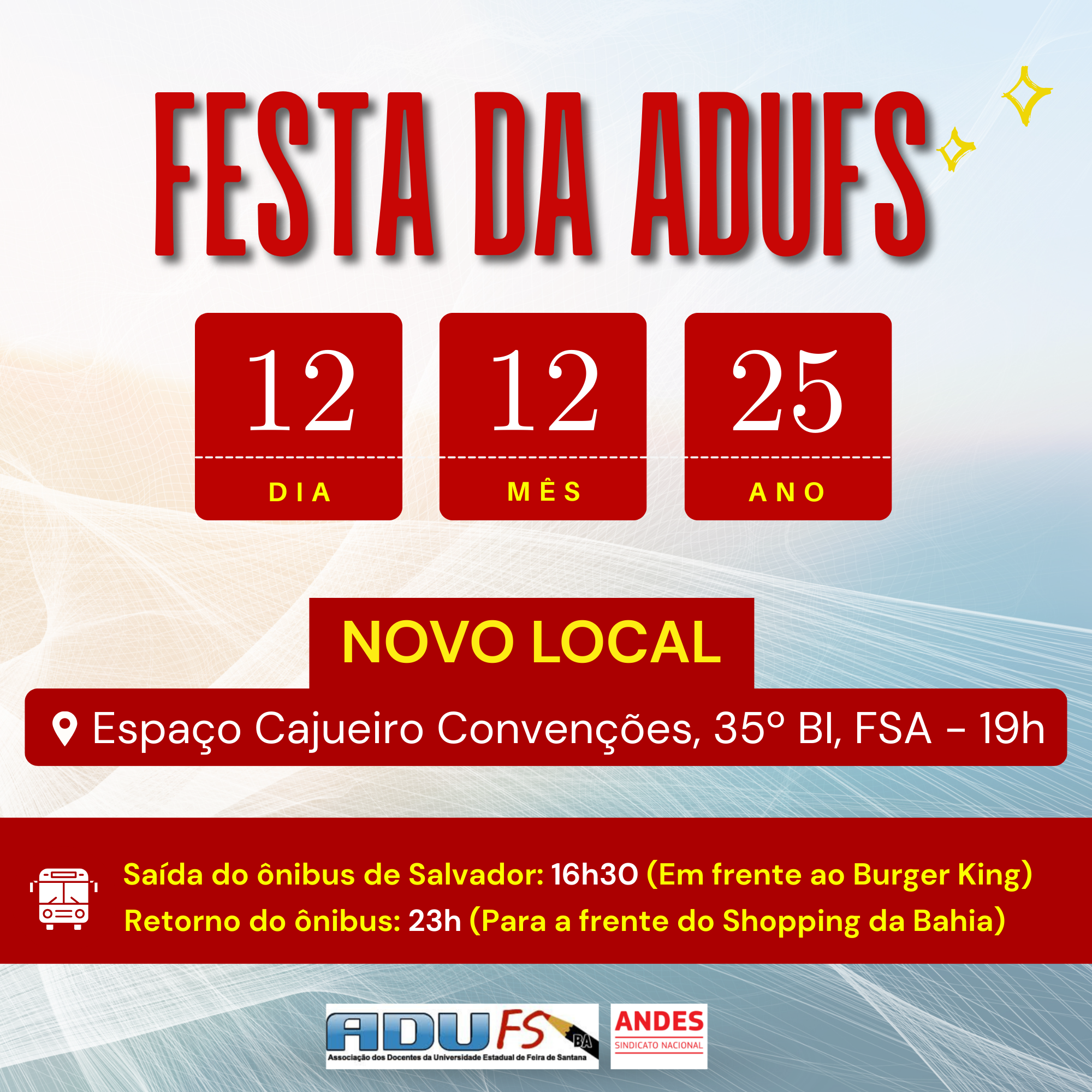 Continue lendo...O dia da Festa da Adufs se aproxima! Será na próxima sexta-feira, 12 de dezembro de 2025, no Espaço Cajueiro Convenções, localizado na Rua Excelsior, 246-316 - 35º BI, Feira de Santana, CEP 44135-000 , a partir das 19 horas.Para as(os) docentes que virão de Salvador, e confirmaram reserva no ônibus, o transporte sairá às 16h30, da frente do Burger King, na Avenida ACM. O retorno está previsto para às 23h, com desembarque em frente ao Shopping da Bahia.⚠️ Atenção para as ...