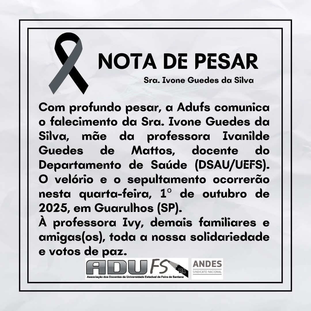 Com profundo pesar, a Adufs comunica o falecimento da Sra. Ivone da Silva, mãe da professora Ivanilde Guedes de Mattos, docente do Departamento de Saúde (DSAU/UEFS). O velório e o sepultamento ...