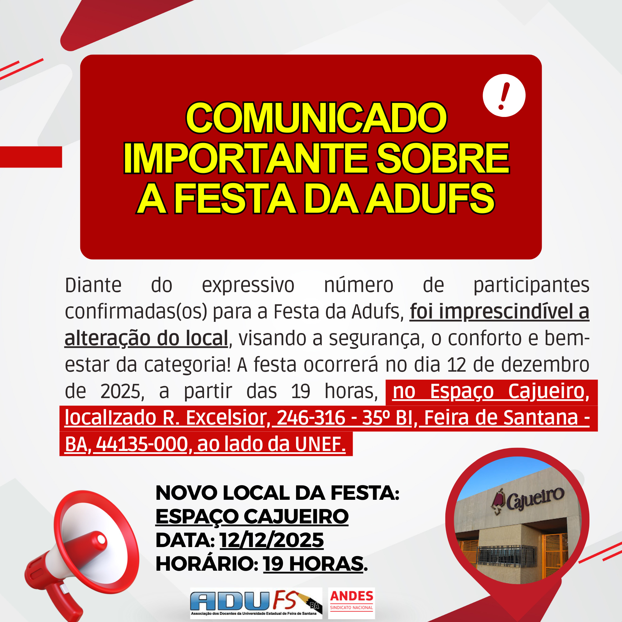 O dia da Festa da Adufs se aproxima! Será na próxima sexta-feira, 12 de dezembro de 2025, no Sítio Campestre, bairro Papagaio, em Feira de Santana, a partir das 19 horas.Para as(os) docentes ...