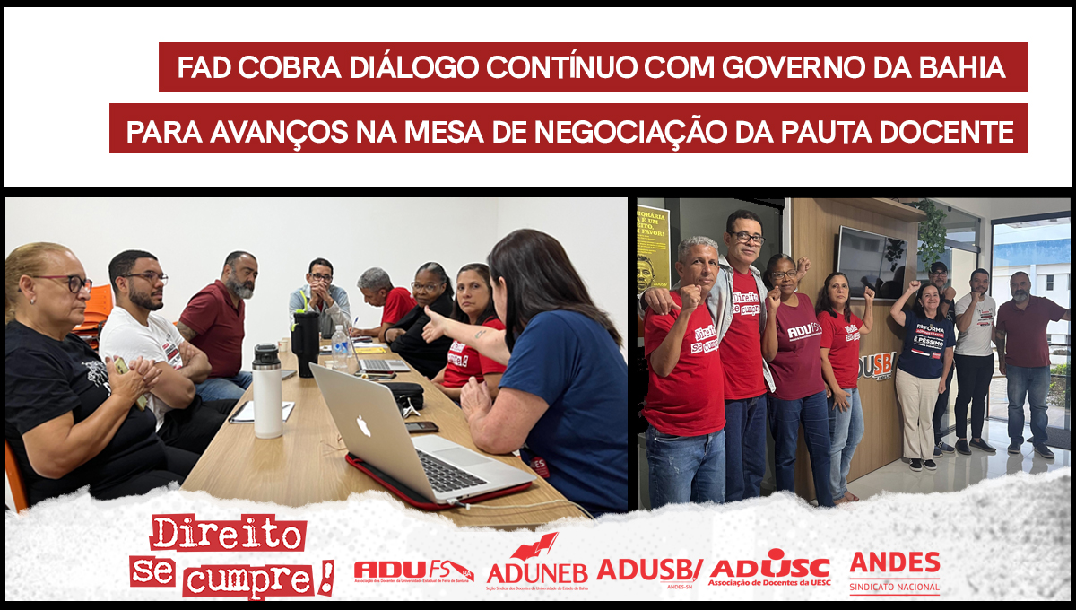 “Depois de muita luta, avançamos no ponto de pauta da recomposição salarial. Mas é importante destacarmos que a negociação dos demais pontos de pauta continua. A mesa de negociação aberta é um canal de diálogo permanente com o governo, que também foi uma conquista do movimento, onde seguiremos lutando e pautando de forma qualificada as demandas da nossa categoria. A liberação das promoções retidas ainda nesse ano, significará uma vitória do Fórum das ADs e da luta unificada do movimento docente do magistério superior baiano.”, reforçou Marcelo Lins, presidente da Adusc e Coordenador do Fórum das ADs.