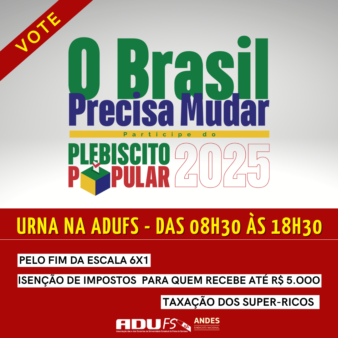 Agora é possível votar no Plebiscito Popular: Por um Brasil mais justo também na Adufs. Das 08h30 às 18h30, a urna ficará aberta na sede da seção sindical, localizada no MT45 (Módulo 4), até o mês de setembro.
