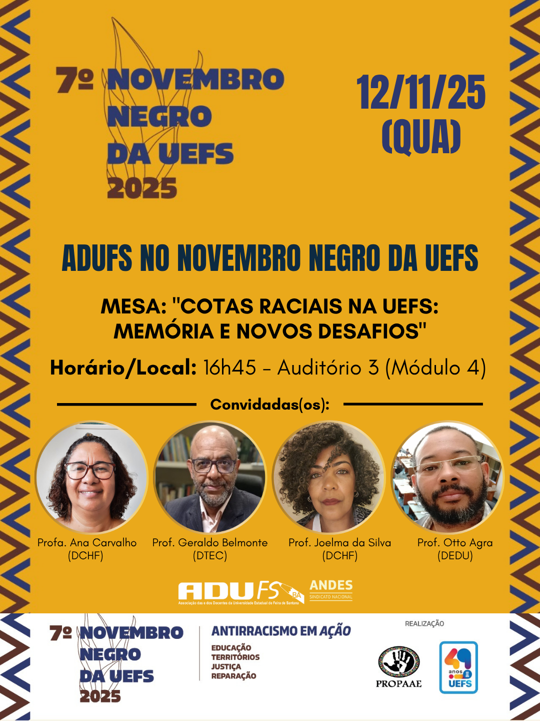 Nos próximos dias 12 e 13 de novembro de 2025, a Adufs realizará, junto à organização do Novembro Negro da UEFS, duas atividades para ampliar as discussões acerca da temática racial e suas complexidades.