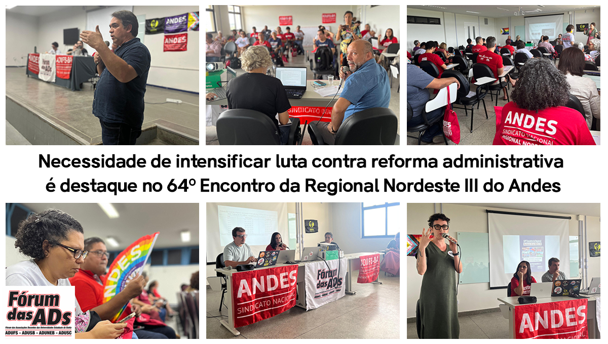 Com organização da Regional Nordeste III do Andes-SN e da Associação de Docentes da Universidade Estadual de Feira de Santana (ADUFS) e apoio do Fórum das ADs (FAD), o 64º Encontro ocorreu nesta sexta e sábado, 31 de outubro e 1 de novembro, em Feira de Santana/BA.