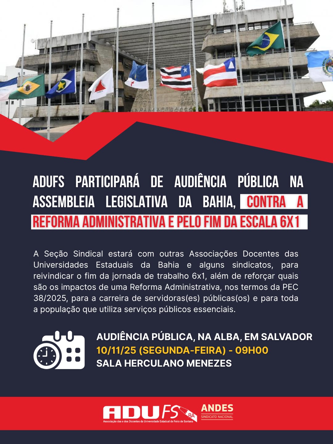 Na segunda-feira, 10 de novembro, a Adufs participará da Audiência Pública que será realizada a partir das 09 horas, com o tema "Não à Reforma Administrativa e Fim da Escala 6X1". A atividade ocorrerá na Sala Herculano Menezes, na ALBA, em Salvador.