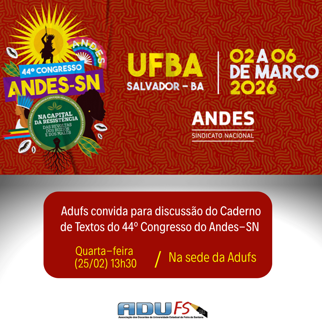 O caderno traz textos de apoio e de resolução sobre as temáticas das quatro plenárias do 44º Congresso, que ocorrerá entre os dias 2 e 6 de março, na Universidade Federal da Bahia (UFBA), em Salvador, Com o tema central “Na capital da resistência, das revoltas dos Búzios e dos Malês: ANDES-SN nas lutas e nas ruas, pela democracia e educação pública, contra as opressões e a extrema direita!”.