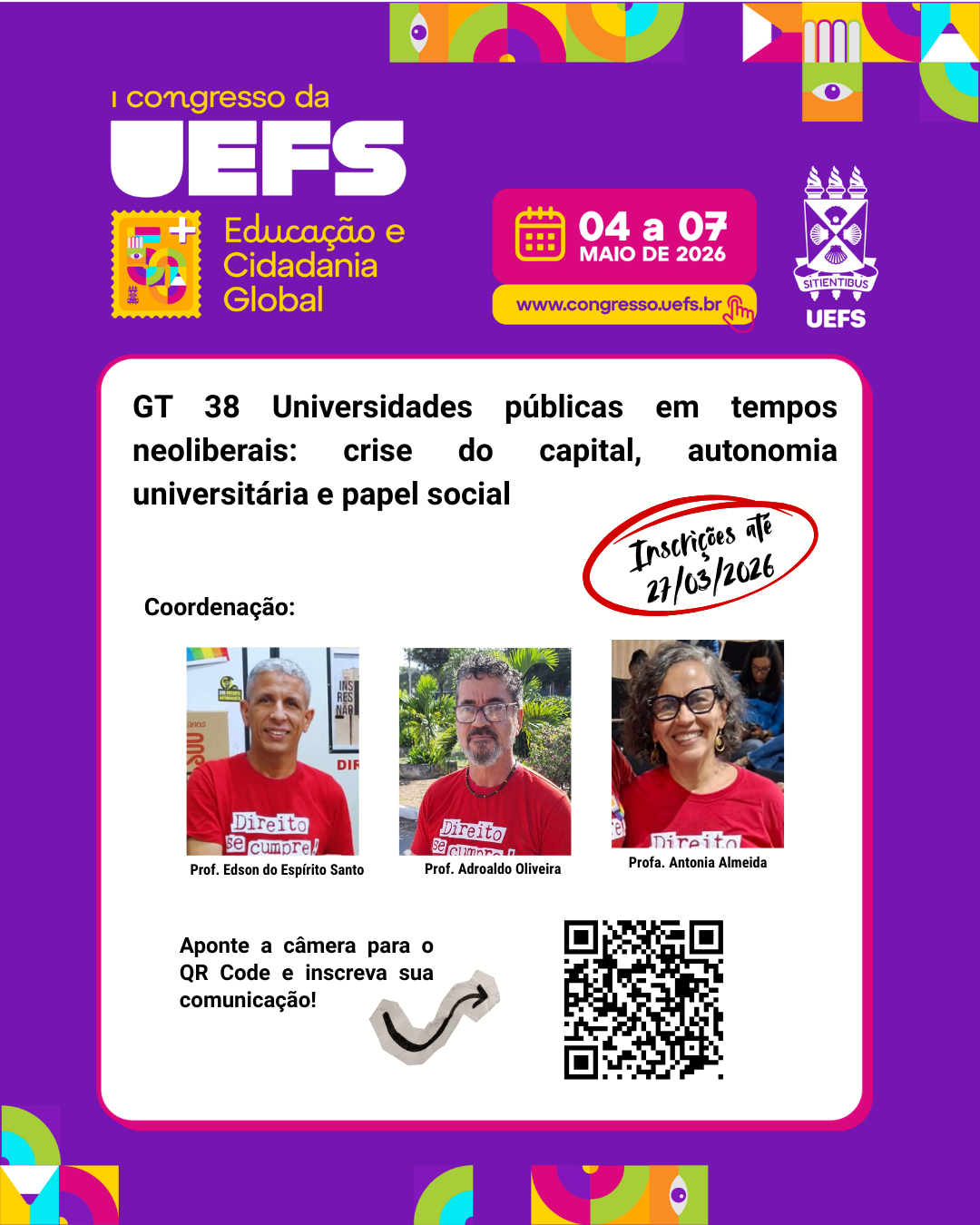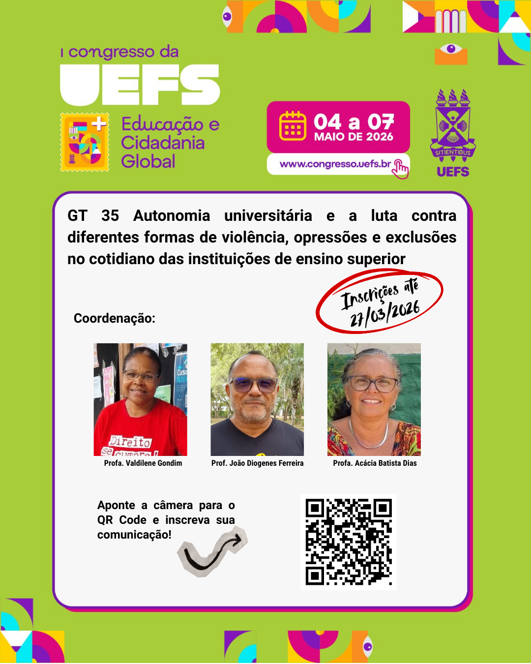 Estão abertas as inscrições para comunicação oral em GT, pôster, lançamento de livros e memória da Uefs do “Congresso UEFS 50+ Educação e Cidadania Global”. Até o dia 27 de março é possível enviar as propostas que devem dialogar com as temáticas dos grupos de trabalhos aprovados. A lista completa de GT’s está disponível no site da @uefsoficial