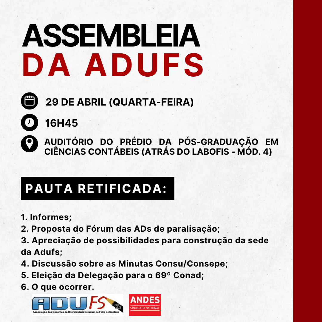 A Diretoria da Adufs retificou a pauta da Assembleia convocada para esta quarta-feira, 29 de abril, às 16h45, no Auditório da Pós-graduação em Ciências Contábeis, localizado atrás do Labofis (Módulo 4).